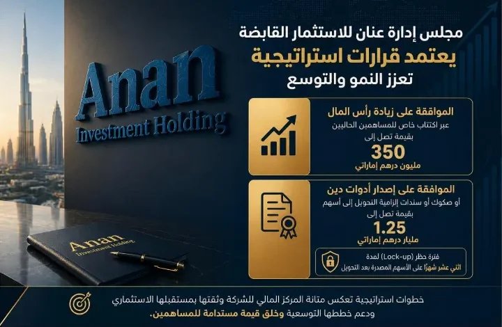 أقرت شركة عنان للإستثمار القابضة خلال اجتماع مجلس إدارتها الأخير قرارات استراتيجية مهمة تعكس قوة الشركة المالية وثقتها بمستقبلها الاستثماري، وتؤكد التزامها بمواصلة النمو والتوسع وتعزيز مكانتها كإحدى أبرز الشركات الاستثمارية الرائدة في دولة الإمارات.